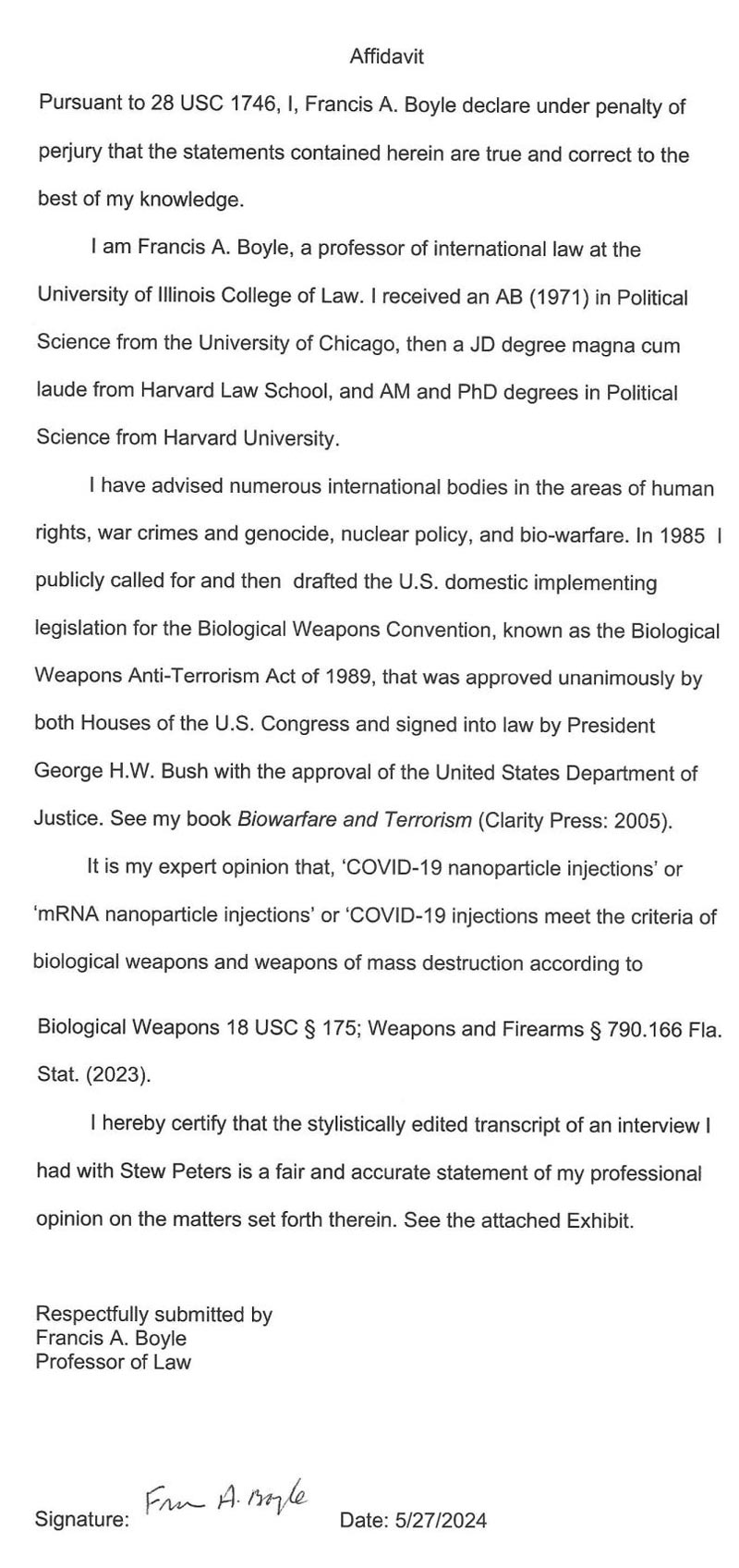 Dr. Boyle has now provided a signed affidavit stating that Covid mRNA injections violate the law he wrote.