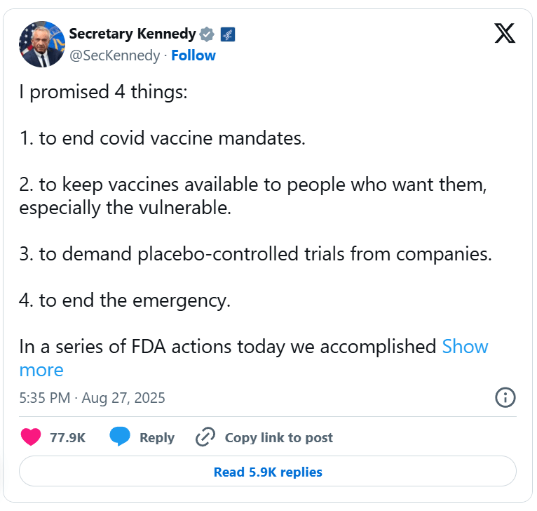 Kennedy said the new policy fulfills four core promises: to end mandates, keep vaccines voluntary, require placebo-controlled trials, and “end the emergency.”