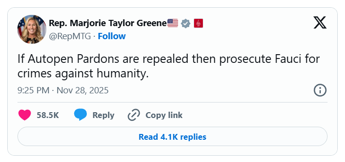In response, Greene called for the prosecution of Fauci, declaring that Biden’s now-voided autopen actions should open the door to long-overdue justice.