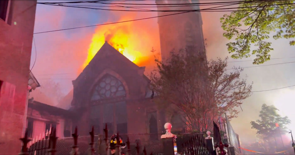 Flames quickly spread to the church itself, escalating into a fifth-alarm fire by the time crews arrived on scene.